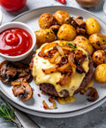 American Wagyu Beef Burger, Baby Potato, Mushrooms, Onions, Cheese, Avocado Oil, Mustard, Granulated Garlic, Kosher Salt, Italian Seasoning, Black Pepper, Ketchup, Mustard