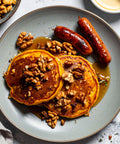 Milk, Maple Syrup, Pumpkin, Unsalted Butter, Honey, Walnuts, Powdered Sugar, Cinnamon, Baking Powder, Kosher Salt, Pancake Mix [Whole Grain Oat Flour, Whey Protein Isolate, Pea Protein, Sweet Cream, Buttermilk, Sea Salt], Nutmeg, Pork Breakfast Sausage