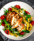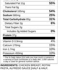 Chicken Breast, Rotini Pasta, Alfredo Sauce [Half & Half, Parmesan And Romano Cheeses, Butter, Flour, Salt, Garlic, Onion Powder, Paprika, Turmeric], Panko Breadcrumbs, Arugula, Pesto (Basil Oil Parmesan Cheese Granulated Garlic Salt), Eggs, Parmesan Cheese, All Purpose Flour, Avocado Oil, Lemon Juice, Kosher Salt, Black Pepper, Granulated Onion, Granulated Garlic, Parsley, Basil