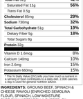 Ground Beef, Spinach & Cheese Ravioli [Enriched Semolina Flour, Spinach, Low-Moisture Part-Skim Mozzarella Cheese, Oil, Ricotta Cheese, Romano Cheese, Bread Crumbs, Eggs, Salt, Garlic Powder, Spices], Marinara Sauce [Tomatoes, EVOO, Salt, Onions, Black Pepper, Basil, Oregano, Parsley], Carrots, Celery, Onions, Fresh Spinach, Avocado Oil, Parmesan Cheese, Parsley, Black Pepper, Garlic, Kosher Salt