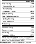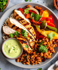 Chicken Breast, Green Bell Pepper, Jasmine Rice, Red Bell Pepper, Avocado Mayo, Avocado Oil, Cilantro, Jalapeno, Parmesan Cheese, Green Chilies, Onions, Kosher Salt, Garlic, Chipotle Pepper, Granulated Onion, Cumin, Black Pepper, Oregano, Chicken Bone Broth, Pinto Beans, Lime Juice, Orange Juice