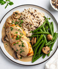 Chicken Breast, Haricot Verts, Wild Rice, Mushrooms, Heavy Cream, Avocado Oil, Cornstarch, Onions, Lemon Juice, Unsalted Butter, All Purpose Flour, Garlic, Kosher Salt, Black Pepper, Granulated Onion, Granulated Garlic, Fresh Thyme, Dried Basil, Parsley, Marsala Cooking Wine, Vegetable Stock [Tomato Juice, Salt, Sugar, Potato, Carrots, Onions]