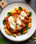 Chicken Breast, Gnocchi [Potato Flour, Wheat Flour, Whole Eggs, Whole Milk, Spices], Tomato Sauce, Fire-Roasted Tomatoes, Shredded Mozzarella, Panko Breadcrumbs, Eggs, Mascarpone Cheese, Fresh Spinach, Onions, Parmesan Cheese, All Purpose Flour, Avocado Oil, Lemon Juice, Fresh Basil, Parsley, Kosher Salt, Garlic, Black Pepper, Granulated Onion, Granulated Garlic, Dried Basil, Parsley, Oregano, Vegetable Stock [Tomato Juice, Salt, Sugar, Potato, Carrots, Onions]