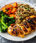 Chicken Breast, Sweet Potato, Broccolini, Quinoa, Honey, Onions, Avocado Oil, Apple Cider Vinegar, Celery, Carrots, Lemon Juice, Kosher Salt, Balsamic Vinegar, Garlic, Chili Powder, Smoked Paprika, Black Pepper, Cumin, Dried Basil, Coriander, Dijon Mustard, Vegetable Stock, Granulated Garlic, Crushed Red Pepper