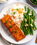 Salmon, Haricot Verts, Jasmine Rice, Avocado Oil, Carrots, Apple Cider Vinegar, Onions, Dijon Mustard, Celery, Sliced Almonds, Sugar, Kosher Salt, Parsley, Garlic, Black Pepper, Orange Juice