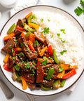 Flat Iron Steak, Green Bell Pepper, Jasmine Rice, Low Sodium Tamari Soy Sauce, Red Bell Pepper, Brown Sugar, Avocado Oil, Sesame Seed, Cornstarch, Garlic, Beef Stock, Kosher Salt, Ground Ginger