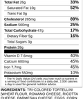 Tri-Colored Tortellini [Wheat Flour, Romano Cheese, Ricotta Cheese, Parmesan Cheese, Eggs, Corn Starch, Asiago Cheese, Spinach, Garlic Powder, Onion Powder, Fontina Cheese], Fire-Roasted Tomatoes, Tomato Sauce, Fresh Spinach, Parmesan Cheese, Onions, Dried Basil, Parsley, Avocado Oil, Garlic, Kosher Salt, Black Pepper, Oregano, Vegetable Stock [Tomato Juice, Salt, Sugar, Potato, Carrots, Onions]