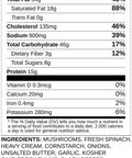 Mushrooms, Fresh Spinach, Heavy Cream, Cornstarch, Onions, Unsalted Butter, Garlic, Kosher Salt, Fresh Thyme, Black Pepper, Marsala Cooking Wine, Vegetable Stock [Tomato Juice, Salt, Sugar, Potato, Carrots, Onions], Mushroom Ravioli [Ricotta Cheese, Porcini Mushrooms, Extra Virgin Olive Oil, Sunflower Oil, Parsley, Garlic, Butter, Grana Padano Cheese, Breadcrumbs, Truffle Oil, Wheat Flour, Eggs]