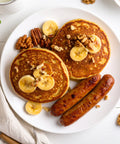 Milk, Maple Syrup, Apple Butter, Walnuts, Banana, Baking Powder, Cinnamon, Pancake Mix [Whole Grain Oat Flour, Whey Protein Isolate, Pea Protein, Sweet Cream, Buttermilk, Sea Salt], Nutmeg, Pork Breakfast Sausage [Pork, Salt, Maple Syrup, Fresh Sage, Pepper, Natural Sheep Casing]
