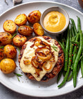 Ground Pork, Baby Potato, Haricot Verts, Caramelized Onions [Sliced Onions, Water, Sugar, Salt], Apple, white cheddar slice, Honey, Onions, Avocado Oil, Apple Cider Vinegar, Kosher Salt, Garlic, Black Pepper, Granulated Garlic, Rosemary, Smoked Paprika, Dijon Mustard