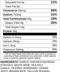 Garlic Chicken Sausage [Chicken, White Wine, Sea Salt, Garlic, Pepper, Rosemary, Lemon Zest], Brown Rice, Yellow Squash, Zucchini, Onions, Green Bell Pepper, Red Bell Pepper, Avocado Oil, Salt Free Seasoning Blend, Kosher Salt, Granulated Garlic, Thyme, Stir Fry Sauce [Soy Sauce, Corn Starch, Sugar, Rice Vinegar, Garlic, Ginger, Green Onion], Vegetable Stock [Tomato Juice, Salt, Sugar, Potato, Carrots, Onions]