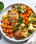 Chicken Breast, Sweet Potato, Cauliflower, Carrots, Yellow Squash, Zucchini, Avocado Oil, Cilantro, Filtered Water, Sliced Almonds, Kale, Kosher Salt, Lemon Juice, Salt Free Seasoning Blend, Black Pepper, Garlic, Crushed Red Pepper, Granulated Onion, Granulated Garlic, Dried Basil, Parsley, Rice Wine Vinegar