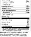 Chicken Breast, Jasmine Rice, Onions, Mushrooms, Zucchini, Avocado Mayo, Baby Corn, Carrots, Avocado Oil, Celery, Low Sodium Tamari Soy Sauce, Garlic, Kosher Salt, Honey, Brown Sugar, Black Pepper, Ground Ginger, Gochujang Sauce [Sugar, Red Chili Pepper, Soy Sauce, Rice Vinegar, Pear, Sake, Onion, Garlic, Sesame Oil, Paprika, Cornstarch, Tomato Paste], Rice Wine Vinegar, Sesame Oil, Chili Paste