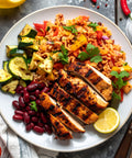 Chicken Breast, Kidney Beans, Yellow Squash, Zucchini, Rice, Onions, Avocado Oil, Green Onion, Salt Free Seasoning Blend, Kosher Salt, Garlic, Thyme, Allspice, Black Pepper, Ground Ginger, Coconut Milk, Jerk Marinade