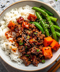 Ground Beef, Jasmine Rice, Haricot Verts, Carrots, Low Sodium Soy Sauce, Brown Sugar, Hoisin Sauce, Onions, Garlic, Sesame Seed, Honey, Avocado Oil, Low Sodium Tamari Soy Sauce, Cornstarch, Sweet Chili Sauce, Beef Stock, Black Pepper, Ground Ginger, Sesame Oil