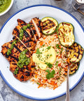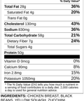 Chicken Breast, Black Beans, Yellow Squash, Zucchini, Jasmine Rice, Avocado Mayo, Avocado Oil, Low Sodium Tamari Soy Sauce, Carrots, Onions, Celery, Cilantro, Jalapeno, Parmesan Cheese, Onions, Garlic, Salt Free Seasoning Blend, Kosher Salt, Cumin, Black Pepper, Smoked Paprika, Cumin, Oregano, Lime Juice, Aji Amarillo