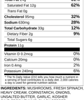 Mushrooms, Fresh Spinach, Heavy Cream, Cornstarch, Onions, Unsalted Butter, Garlic, Kosher Salt, Fresh Thyme, Black Pepper, Marsala Cooking Wine, Vegetable Stock [Tomato Juice, Salt, Sugar, Potato, Carrots, Onions], Mushroom Ravioli [Ricotta Cheese, Porcini Mushrooms, Extra Virgin Olive Oil, Sunflower Oil, Parsley, Garlic, Butter, Grana Padano Cheese, Breadcrumbs, Truffle Oil, Wheat Flour, Eggs]