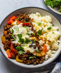 Ground Beef, Cauliflower Rice, Mushrooms, Shredded Provolone, Onions, Carrots, Ketchup, Green Bell Pepper, Avocado Oil, Red Bell Pepper, Onions, Worcestershire Sauce, Beef Stock, Cornstarch, Kosher Salt, Garlic, Black Pepper