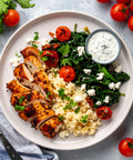 Chicken Breast, Cauliflower Rice, Fresh Spinach, Tzatziki Sauce [Greek Yogurt, Skim Milk, Lemon Juice, Garlic, Salt, Cucumber], Feta Cheese, Carrots, Roasted Tomato, Avocado Oil, Onions, Lemon Juice, Garlic, Kosher Salt, Black Pepper, Parsley, Oregano, Thyme, Rosemary