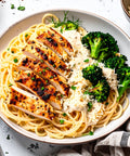 Chicken Breast, Alfredo Sauce [Half & Half, Parmesan Cheese, Romano Cheese, Butter, Flour, Salt, Garlic, Onion Powder, Paprika, Turmeric], Broccolini, Spaghetti Pasta, Parmesan Cheese, Parmesan Cheese, Lemon Juice, Avocado Oil, Kosher Salt, Black Pepper, Granulated Onion, Granulated Garlic, Dried Basil, Parsley