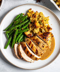 Chicken Breast, Stuffing Mix, Green Beans, Onions, Sour Cream, Mushrooms, Celery, Unsalted Butter, Milk, Avocado Oil, Crispy Onions, Cornstarch, Chicken Stock, Salted Butter, All Purpose Flour, Lemon Juice, Kosher Salt, Granulated Garlic, Granulated Onion, Parsley, Black Pepper, Dried Basil, Parsley