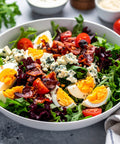 Mixed Greens, Bacon, Greek Yogurt, Cherry Tomato, Hard Boiled Egg, Blue Cheese, Lemon Juice, Granulated Garlic, Honey, Kosher Salt, Granulated Onion, Dill