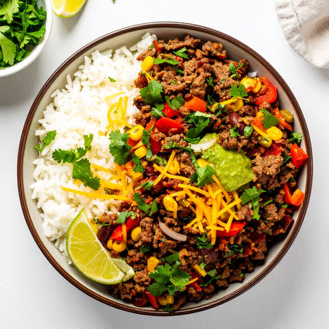 Ground Beef, Basmati Rice, Fire-Roasted Crushed Tomatoes, Onion, Frozen Corn Kernels, Green Bell Pepper, Avocado Mayo, Cheddar Cheese, Cilantro, Avocado Oil, Jalapeno, Parmesan Cheese, Green Chilies, Kosher Salt, Onion Powder, Garlic, Garlic, Pinto Beans, Lime Juice