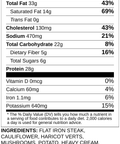 Flat Iron Steak, Cauliflower, Haricot Verts, Mushrooms, Potato, Heavy Cream, Cream Cheese, Red Wine Vinegar, Avocado Oil, Cornstarch, Onions, Unsalted Butter, Montreal Seasoning, Kosher Salt, Garlic, Granulated Garlic, Fresh Thyme, Granulated Onion, Black Pepper, White Pepper, Marsala Cooking Wine, Vegetable Stock [Tomato Juice, Salt, Sugar, Potato, Carrots, Onions]