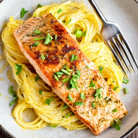 Spaghetti Squash, Salmon, Unsalted Butter, Parmesan Cheese, Dried Parsley Leaves, Lemon Zest, Black Pepper, Lemon Juice, Kosher Salt, Olive Oil