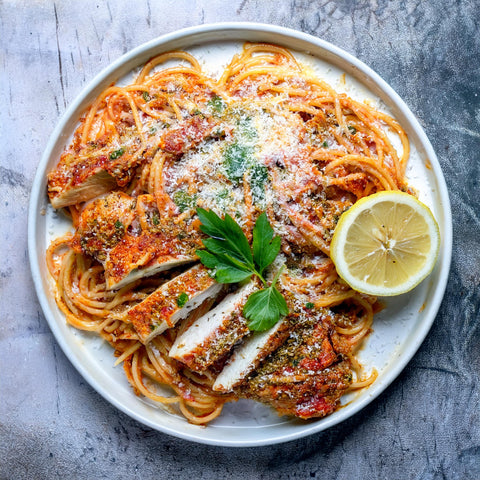 Chicken Breast, Marinara Sauce, Spaghetti Pasta, Fresh Spinach, Panko Breadcrumbs, Avocado Oil, Grapeseed Oil, Ricebran Oil, Extra Virgin Olive Oil, Lemon Juice, Parmesan Cheese Shredded, Kosher Salt, Garlic Powder, Dried Parsley Leaves, Granulated Onion, Black Pepper, Basil