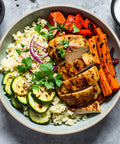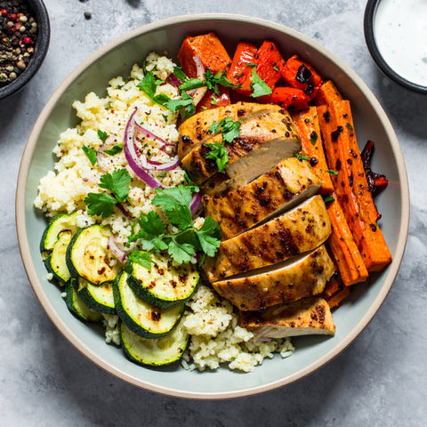 Chicken Breast, Cauliflower Rice, Hummus, Tzatziki Sauce, Red Onion, Yellow Squash, Zucchini, Green Bell Pepper, Carrots, Avocado Oil, Onion, Garlic, Lemon Juice, Kosher Salt, Ground Cumin, Cardamom Ground, Coriander, Smoked Paprika, Black Pepper, Cayenne Pepper