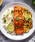 Salmon, Yellow Squash, Zucchini, Basmati Rice, Mango, Avocado Oil, Cilantro, Honey, Red Wine Vinegar, Tajin, Salt Free Seasoning Blend, Kosher Salt, Fresh Basil, Maple Syrup, Granulated Onion, Black Pepper, Fresh Ginger, Garlic, Coconut Milk, Lime Juice