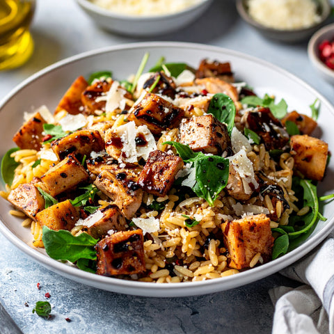 Sweet Potato, Chicken Breast, Orzo Pasta, Avocado Oil, Balsamic Vinegar, Parmesan Cheese, Honey, Kale, Lemon Juice, Kosher Salt, Garlic, Black Pepper, Granulated Onion, Granulated Garlic, Dried Basil, Parsley, Vegetable Stock [Tomato Juice, Salt, Sugar, Potato, Carrots, Onions], Dijon Mustard