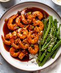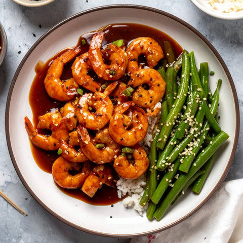 Shrimp, Haricot Verts, Jasmine Rice, Teriyaki Sauce [Sugar, Soy Sauce, Prune Juice, Salt], Hoisin Sauce, Onions, Low Sodium Soy Sauce, Garlic, Honey, Low Sodium Tamari Soy Sauce, Fresh Ginger, Avocado Oil, Sesame Seed, Crushed Red Pepper, Sesame Oil
