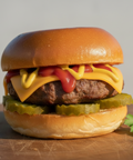 Ground Beef, Pickles, Cheddar Cheese, Ketchup, Mustard, Brioche Bun
