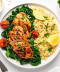Chicken Breast, Fresh Spinach, Couscous, Kale, Lemon Juice, Tahini Paste, Roasted Tomato, Maple Syrup, Avocado Oil, Kosher Salt, Lemon Zest, Parsley, Garlic, Granulated Onion, Granulated Garlic, Dried Basil, Parsley, Black Pepper
