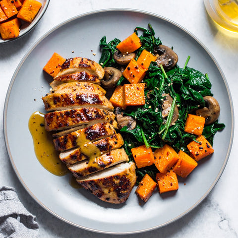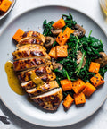 Butternut Squash, Chicken Breast, Mushrooms, Fresh Spinach, Maple Syrup, Dijon Mustard, Mustard, Avocado Oil, Brown Sugar, Garlic, Fresh Rosemary, Fresh Thyme, Kosher Salt, Black Pepper, Salt Free Seasoning Blend, Oregano, Dijon Mustard, Rice Wine Vinegar