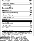 Tofu, Jasmine Rice, Mushrooms, Carrots, Green Bell Pepper, Onions, Brown Sugar, Red Bell Pepper, Fresh Basil, Avocado Oil, Peanut Butter, Garlic, Cornstarch, Fresh Ginger, Kosher Salt, Curry Paste [Dried Red Chili, Lemongrass, Shallots, Salt, Garlic, Shrimp Paste, Lime Peel, Coriander, Cumin, Pepper], Coconut Milk, Lime Juice