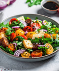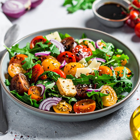 Crutons, Mixed Greens, Apple Cider Vinegar, Water, Heirloom Tomato Baby, Arugula, Red Onion, Parmesan Cheese, Balsamic Vinegar, Avocado Oil, Honey, Sugar, Garlic, Kosher Salt, Black Pepper, Pepper Black Whole Peppercorn, Fennel Seed Whole, Coriander Seed, Mustard Dijon