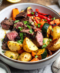Flat Iron Steak, Baby Potato, Yellow Squash, Zucchini, Green Bell Pepper, Red Onion, Carrots, Avocado Oil, Avocado Mayo, Greek Yogurt, Low Sodium Tamari Soy Sauce, Lemon Juice, Worcestershire Sauce, Brown Sugar, Parsley, Lemon Zest, Garlic, Black Pepper, Kosher Salt, Granulated Garlic, Sugar, Italian Seasoning, Parsley, Dried Basil, White Wine Vinegar, Dijon Mustard
