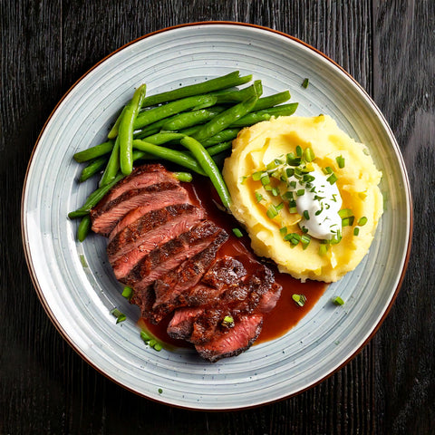 Flat Iron Steak, Potato, Bacon Bits, Haricot Verts, Sour Cream, Heavy Cream, Unsalted Butter, Milk, Chives Fresh, Cheddar Cheese, Red Wine Vinegar, Avocado Oil, Montreal Seasoning, Garlic, Black Pepper, Kosher Salt