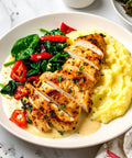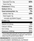 Chicken Breast, Cauliflower, Asparagus, Alfredo Sauce [Half & Half, Parmesan And Romano Cheeses, Butter, Flour, Salt, Garlic, Onion Powder, Paprika, Turmeric], Potato, Cream Cheese, Roasted Red Peppers, Milk, Fresh Spinach, Parmesan Cheese, Unsalted Butter, Avocado Oil, Lemon Juice, Kosher Salt, Granulated Garlic, Granulated Onion, Black Pepper, Parsley, Basil, White Pepper