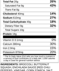 Broccoli, Butternut Squash, Enchilada Sauce [Red Chili Peppers, Vinegar, Corn Starch, Salt, Garlic], Black Beans, Sour Cream, Chipotle Salsa [Tomato, Onion, Jalapeno, Green Bell Pepper, Cilantro, Salt, Vinegar, Sugar, Paprika, Cumin, Garlic, Lime Juice], Green Bell Pepper, Shredded Mozzarella, Grilled Corn, Onions, Avocado Oil, Chili Powder, Cumin, Kosher Salt, Corn Tortilla